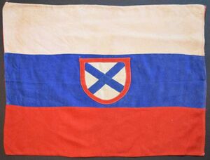 Нарукавный шеврон РОА представлял собой андреевский щиток с красным кантом. На фотографиях, запечатлевших известное Пражское заседание КОНР 14 ноября 1944 года, отчётливо видно, что сцену украшают два огромных знамени: нацистский флаг со свастикой и Андреевский флаг[40].