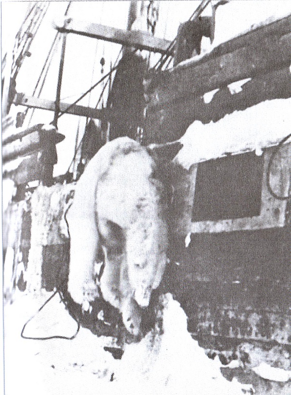 Следующее приключение Бирули и Колчака на этой зимовке могло окончиться печально. Они с двумя матросами решили спустить драгу в трещину во льду. Внезапно появилась белая медведица с подросшим медвежонком. Только случайно увязавшийся за людьми пёс смог напугать медведей и заставить их нырнуть в трещину. Около 30 минут пёс лаял, не выпуская медведей из воды; медведица схватила его и утащила под лёд, но он смог вынырнуть обратно и продолжал лаять, пока не подоспели бегавшие за ружьями на базу матросы[76].