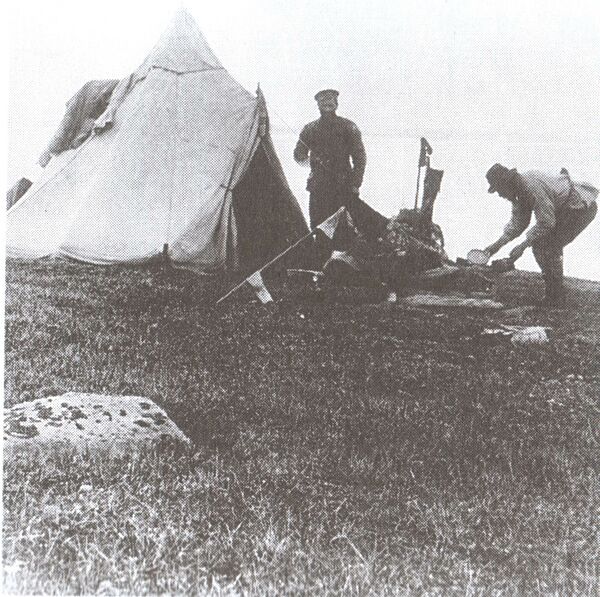 Здесь я велел зарыть ящик с 48 банками консервированных щей, запаянный жестяной ящик с 6 кг сухарей, запаянный жестяной ящик с 6 кг овсянки, запаянный ящик, содержащий около 1,6 кг сахару, 4 кг шоколада, 7 плиток и 1 кирпичик чаю. Яма была засыпана глиной и камнями и обозначена деревянным крестом.