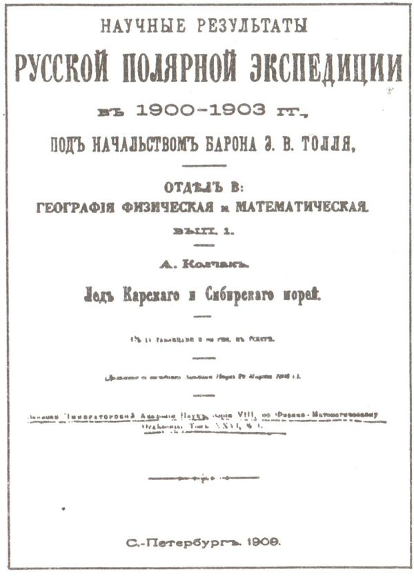 По результатам работ экспедиции была составлена геологическая карта полуострова Таймыр и острова Котельный. Краткий физико-географический и биологический очерк северного побережья Сибири содержит сведения о климате, гидрографии, геологии, орографии, животном и растительном мире Таймыра и Новосибирских островов. На материалах экспедиции Колчак выполнил фундаментальное исследование, посвящённое льдам Карского моря и моря Лаптевых, представлявшее собой новый шаг в развитии полярной океанографии, а как гидрохимик занимался измерением солёности, собирал пробы растворённых в морской воде газов, запланировав посвятить этой стороне исследований отдельную работу. Как участник экспедиции Колчак выполнял всевозможные работы и поручения, но как учёный-исследователь одновременно он занимался изучением «метаморфоз льда», что и составило материал для монографии «Лёд Карского и Сибирского морей», занимающей более 170 страниц с приложением 11 таблиц и 24 фотографий разных форм льда, автор, в числе прочего, не только сформулировал основные направления происходящего под влиянием ветров и течений движения льдов в районе Новосибирских островов, но и предложил схему движения арктического пака для всего полярного бассейна. Собранный Колчаком гляциологический материал не потерял актуальности даже сегодня. К примеру, известный учёный, лауреат двух Государственных премий академик РАН А. П. Лисицын на научных конференциях многократно ссылался на арктические исследования А. В. Колчака, указывая на их значение для современной океанологии[152].