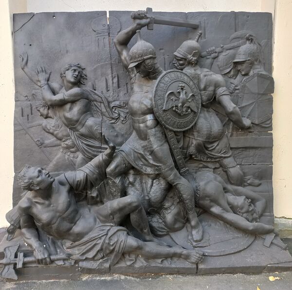 Продолжением этой патриотической тематики, однако уже целиком связанной собственно с историей Отечественной войны, стали памятники работы Бориса Орловского в честь Кутузова и Барклая-де-Толли перед Казанским собором. «Орловскому удалось убедительно передать роль каждого полководца в минувшей войне, лапидарно обрисовать их характер и превосходно связать памятники с ансамблем собора»[3]. Развивалось искусство Демута-Малиновского, также испытавшего влияние освободительных идей. Он создал статую «Русского Сцеволы». Фёдор Толстой создал превосходную серию медальонов, посвящённых Войне 1812 года. «Толстой был большим знатоком античного искусства — его рельефы, круглая скульптура и графика стали характерным проявлением русского классицизма»[3].
