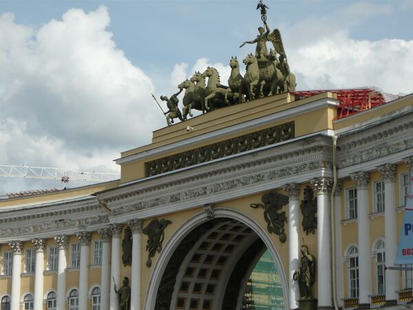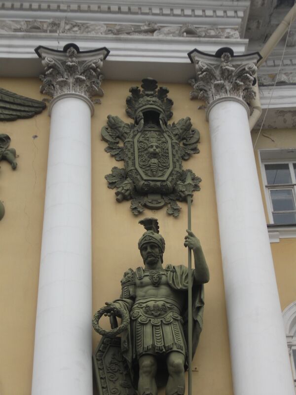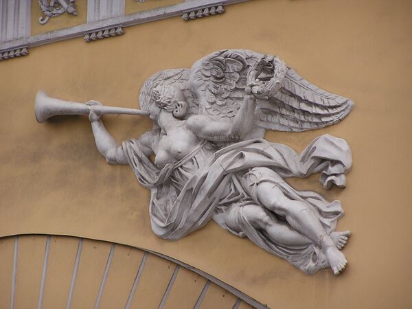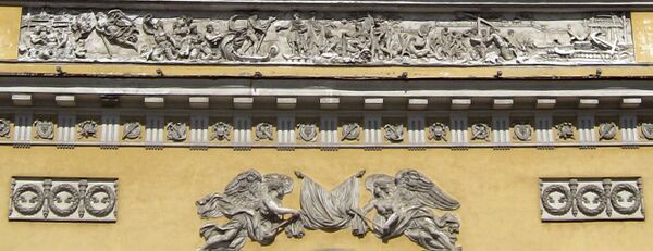 «К лучшим образцам декоративной пластики того времени относятся также украшения здания Биржи в Петербурге, построенной Томоном, и особенно фигуры, сидящие у Ростральных колонн»[3]. Раньше, в XVIII веке, скульптурные украшения во многих случаях являлись абстрактными аллегориями, то теперь их смысл стремились активно связывать с реальностью, предназначением сооружения. Характерные примеры — убранство арки здания Главного штаба, созданное Василием Демут-Малиновским и Степаном Пименовым, московские Триумфальные ворота работы Ивана Витали и Ивана Тимофеева, Нарвские триумфальные ворота работы Демута-Малиновского и Пименова вместе с Петром Клодтом. «В этих образцах звучали патриотические идеи, утверждался героизм русского народа, одержавшего блистательную победу в войне с французами»[3]. Типичные черты: фигура Славы на колеснице, фигуры воинов, торжественный ритм коней, которые влекут победную колесницу, летящие славы, военная арматура, аллегорическое изображение освобождения Москвы и т. п. «Трудно представить себе архитектуру классицизма без этой пластики. Она стала неотъемлемой частью стройных и строгих портиков, арочных пролётов. Она органически слилась с городским ансамблем, придала ему особую, строгую красоту, углубила содержание архитектуры, обогатила её живописностью объёмов, игрой светотени». Скульпторам того времени удавалось передать значительное содержание в форме строгой величавости[3].