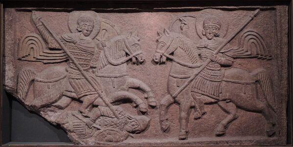 Одна из древнейших сохранившихся круглых русских скульптур — каменная раскрашенная статуя Святого Георгия Победоносца, украшавшая ворота Московского Кремля. Она была создана бригадой Василия Ермолина в 1464 году, и её установка стала одним из знаков изменения политики русского государства при Иване III. По её образцу создавались аналогичные деревянные изображения, которые Иван III рассылал в церкви городов, присоединяемых к московскому княжеству; на настоящий момент сохранилось три такие скульптуры Георгия (ГТГ, ГРМ и Ростовский кремль).