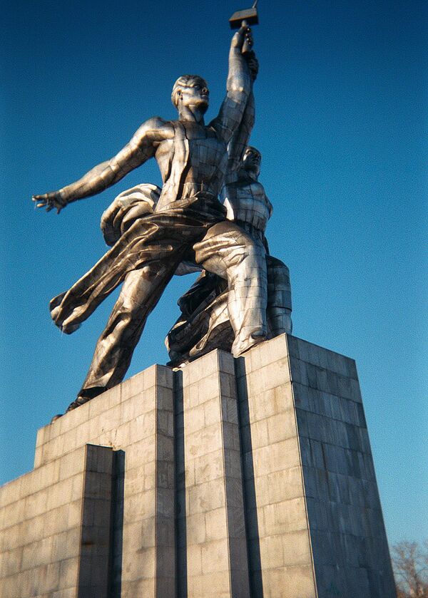 Основная тенденция развития скульптуры этого периода — также тяготение к монументальности. Ясней всего их выражает творчество Веры Мухиной. Её работы этого периода — портрет доктора А. А. Замкова (1934-35) — мужа скульптора, а также архитектора С. А. Замкова (1934-35), который приводился советскими искусствоведами как пример «собирательного образа молодого человека 1930-х годов»[17]. В 1936 году в Париже состоялась Всемирная выставка, советский павильон для которой создал Борис Иофан. Мухина выиграла конкурс на создание статуи, которая по замыслу Иофана должна была его увенчивать — так появилась знаменитая скульптурная группа «Рабочий и колхозница», прославившая её имя. В конце 30-х она принимает участие в ряде конкурсов, в частности, создавая проект памятника молодому Максиму Горькому в переименованном в его честь Нижнем Новгороде. Также она выполняет ряд моделей и декоративных проектов для украшения новых сооружений — Москворецкого моста, статую «Родина» для Рыбинского узла канала Москва-Волга и проч.[17]
