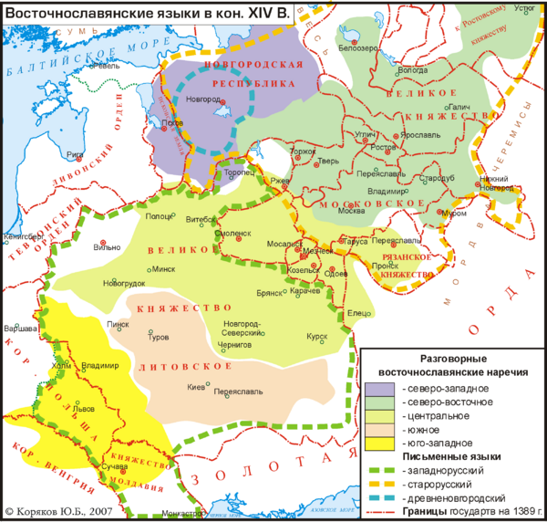Дальнейшая консолидация древнерусской народности была прервана распадом Древнерусского государства и Монгольское нашествие на Русьм, а объединение прежних русских княжеств под властью крупных государств (Великое княжество Московское, Великое княжество Литовское и позже Речь Посполитая) заложило основу для дальнейшего распада её на три современных народа: русских, украинцев и белорусов[120].