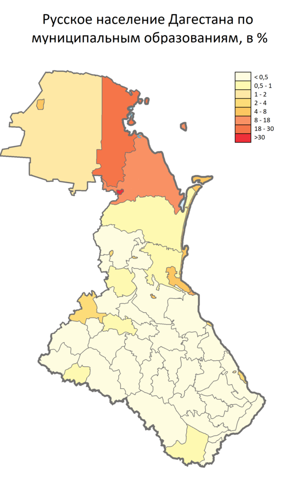 Первым русским поселением на территории современной республики Дагестан была крепость Терки (Терский город), основанная в 1588—1589 годах в устье реки Терек. После включения в 1813 году всего края в состав Российской империи русские жители появились и к югу от Терека. С этого времени русский язык стал распространяться как язык межнационального общения по всему Дагестану и Закавказью[4]. Сельское русское население продолжало концентрироваться в дельте Терека, которая долгое время не входила в состав республики. В города к югу от Терека в первые десятилетия советской власти прибыло большое количество русских специалистов из других регионов РСФСР. Максимальная доля русских в республике была зафиксирована в 1950 году, когда русские составляли 20,1 % населения Дагестана (213,8 тысяч чел.). В это время в Махачкале доля русских достигла 60 %, в Каспийске — 65,5 %. Впрочем, более низкий естественный прирост, а также усилившаяся урбанизация горских народов параллельно с усиливающейся конкуренцией на рынке труда и образования привели к усилению миграционного оттока русского населения начиная с конца 1960-х годов и быстрому сокращению как его доли, так и численности. К началу XXI века (перепись 2002 года) только в городе Кизляр (54 %) и подчинённом ему пгт Комсомольский (81 %) русские продолжали составлять более половины населения. В городах Махачкале и Каспийске их доля понизилась до 17—18 %, в посёлках Дубки (16 %) и Сулак (12 %) их присутствие было также заметным, но постепенно сокращающимся. Доля русских и терских казаков в городе Кизляре сократилась с 83,0 % (31 350 человек из 37 786 горожан) в 1959 году до 40,49 % (19 835 человек из 48 984 горожан) в 2010 году[5]. По переписи 2010 года только в пгт Комсомольский русские составляли более половины (50,9 %) населения.