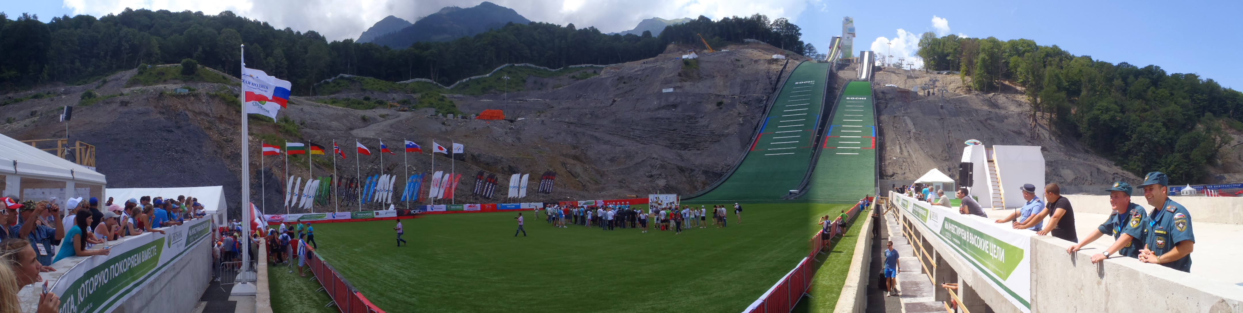 Строительство Комплекса трамплинов велось поэтапно, части объекта начинали использоваться по мере их завершения. В процессе строительства полного комплекса, в период 2012—2014 годов, на Русских горках проводились российские и международные соревнования. Основными задачами этих соревнований, помимо спортивной составляющей, были: проверка работы составных частей инфраструктуры, отладка и настройка инженерных систем, отработка взаимодействия служб эксплуатации объекта, организаторов, служб и ведомств безопасности, подрядчиков. Именно поэтому данные соревнования носят названия «тестовые». В организации всех тестовых соревнований принимали участие сотрудники Федерации прыжков на лыжах с трамплина и лыжному двоеборью России, ФГАУ «Управление по организации и проведению спортивных мероприятий», АНО "Оргкомитет «Сочи 2014», ОАО «Красная поляна».