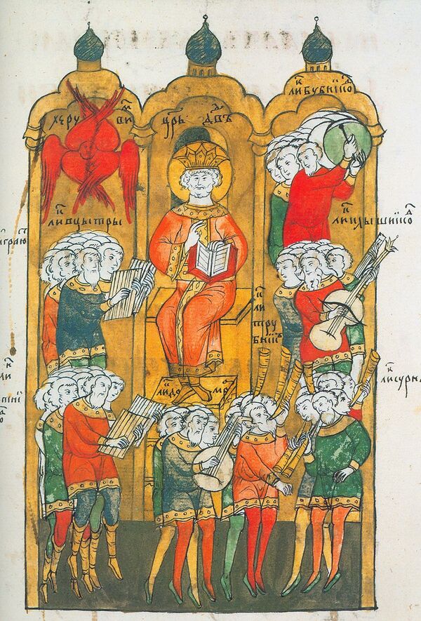 На фресках в башне Софийского собора (заложен в 1037 г.) изображены скоморохи, играющие на арфе, трубе и флейте, плясуны, водящие хоровод. Подобные изображения имеются и в Дмитриевском соборе во Владимире (XII век), на новгородской иконе «Знамение», в Летописном своде 1205—1206 годов.