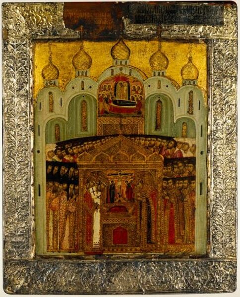 Например, в иконе «Положение риз» (ок. 1630)[13], где изображено получение царем Михаилом и патриархом Филаретом реликвии, реальные личности изображены в конкретной обстановке внутри собора, переданного с документальной точностью. По существу, это историческая картина-портрет. Интересен и групповой портрет купцов Никитниковых (Церковь Троицы в Никитниках, роспись 1652—1653) в сцене «Великого входа»)[14].