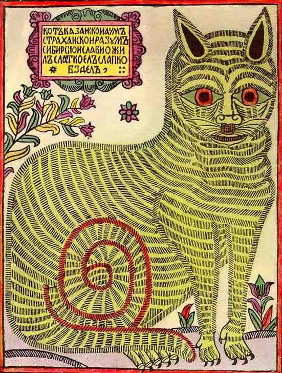 Лубок был одной из первых известных форм народных гравюр в России, которая стала популярной примерно в то же время. Подобно комиксам, он изображал различные сюжеты — часто юмористические — анекдоты в виде примитивистских картинок с подписями. Среди общих персонажей был Кот Казанский, изображённый, в частности, на одной из самых известных лубочных картинок «Мыши кота погребают», описываемой различными исследователями как пародия на похороны Петра I, празднование побед русских над татарами в конце XVI века или просто иллюстрация к старинной сказке[8][1].