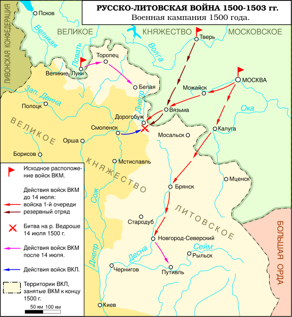 14 июля 1500 года в битве на Ведроше (в нескольких километрах от Дорогобужа) русские войска нанесли сокрушительное поражение литовцам, потерявшим около 8 тысяч человек убитыми и многих, в том числе князя К. И. Острожского, пленными.