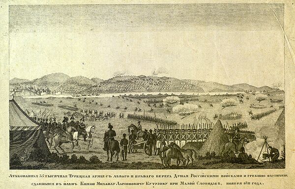 Вслед за этим план Кутузова был приведён в исполнение: 1 октября отряд генерала Маркова (5 тысяч пехоты, 2,5 тысячи конницы и 38 орудий) переправился на правый берег Дуная и 2 октября, на рассвете, внезапно атаковал остававшиеся там османские войска, которые, поддавшись паническому страху, бежали частью в Рущук, частью к Разграду. Вслед за тем Марков, выставив на правом берегу свои батареи, стал громить лагерь визиря. Тогда визирь немедленно обратился к Кутузову с просьбой о перемирии, но, не дождавшись ответа, ночью переплыл на лодке в Рущук, передав начальство Чапан-оглы. 3 октября русская Дунайская флотилия окончательно прервала сообщения с правым берегом, и остатки османской армии с истощением всех припасов оказались в отчаянном положении[16].
