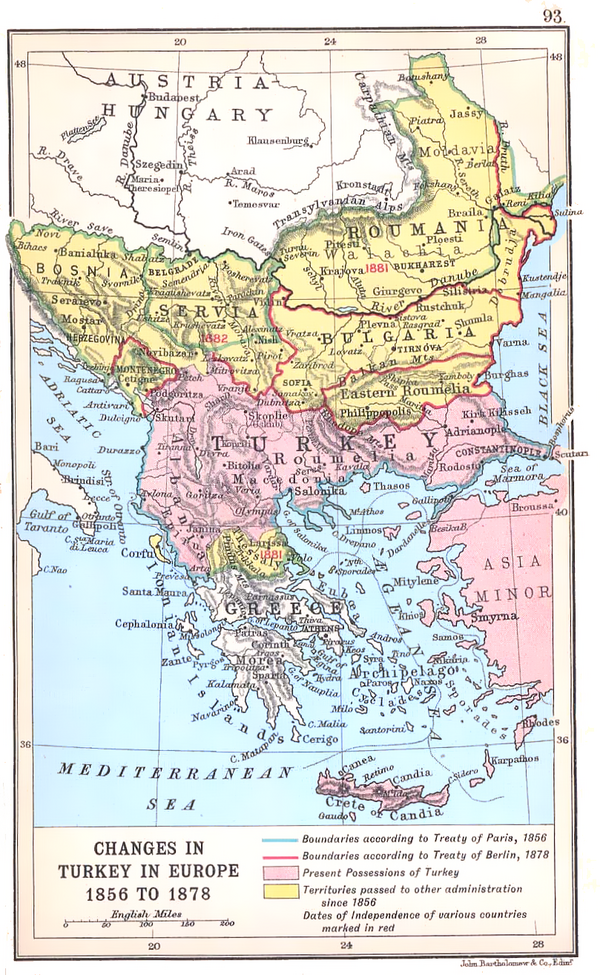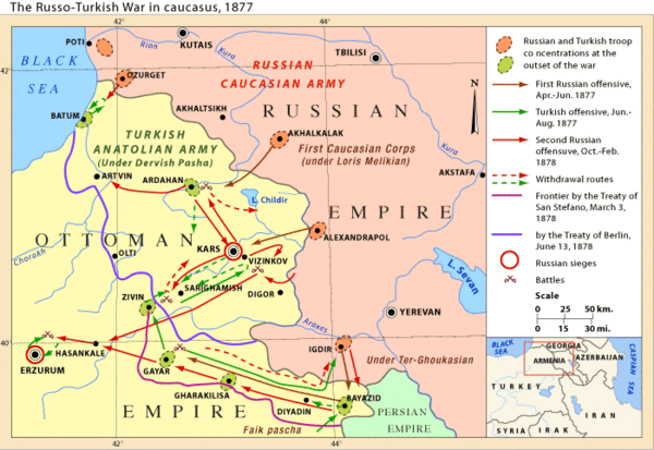 На мирном конгрессе (лето 1878 года) был подписан Берлинский трактат, зафиксировавший возврат России южной части Бессарабии и присоединение Карса, Ардагана и Батума. Была восстановлена государственность Болгарии[7]; увеличились территории Сербии, Черногории, Валахии и Молдавии, а турецкая Босния и Герцеговина была оккупирована Австро-Венгрией.