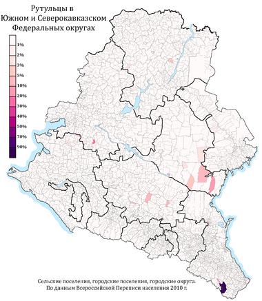 Основная численность рутульцев традиционно проживает в Рутульском районе Дагестана (Россия), в долине реки Самур и его притоков. Рутульское село Хнов (Хин) расположено в долине р. Ахты-чай в Ахтынском районе[30]. По переписи 2010 года в России проживало 35 240 рутульцев[31], из которых 27 849 в Дагестане[32]. Рутульцы-горожане проживают в Махачкале, Каспийске, Дербенте, Кизляре, Хасавюрте и в др. городах Дагестана. Рутульские аулы расположены в нескольких обособленных регионах Дагестана: