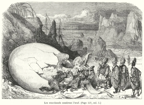 Жители острова сообщают, что в определенную пору года из южных краев прилетают удивительные птицы, которых они называют „Рух“. С виду они напоминают орла, только размерами куда огромней; они так громадны и могучи, что лапами своими хватают слона и поднимают его в воздух, а поднявши, бросают на землю, дабы его убить и потом расклевать вплоть до костей. Люди, видевшие эту птицу, утверждают, что крылья её в развороте достигают с края до края шестнадцати шагов, а перья имеют в длину восемь шагов и соответственную ширину.