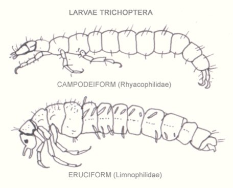 Реже встречаются личинки, которые не имеют чехликов, — так называемые камподеовидные личинки. Такие личинки в основном являются хищниками, строящими особые ловчие сети из тонких паутинных нитей. Такие сети, имеющие вид воронок, располагаются широким отверстием против течения и прикрепляются неподвижно к водным растениям, камням и другим подводным предметам.