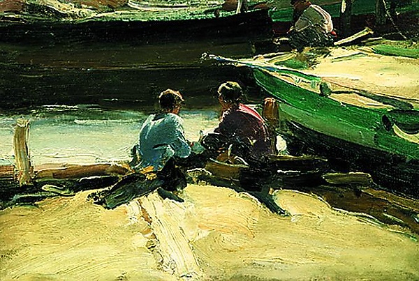 На полотне изображена сцена на берегу реки, где двое мальчиков в голубой и розовой рубашках сидят спиной к зрителю. Справа у берега находится лодка, с которой мужчина занимается рыбалкой. Композиция построена в традициях бытового жанра, передавая атмосферу спокойного досуга на природе.