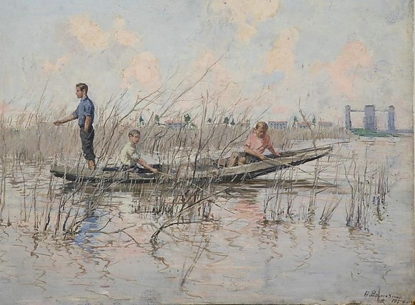 На переднем плане картины изображена река, из воды которой поднимаются тонкие ветки кустов. За ними расположена лодка, в которой находятся трое мальчиков с удочками. Мальчик в розовой рубашке сидит на носу лодки почти в фас, мальчик в жёлтой рубашке занимает место ближе к корме, изображён в профиль с резко повернутой вправо головой. На корме стоит мальчик в синей рубашке: он держит удочку правой рукой, а левую убрал в карман брюк. За рекой виднеется низкий берег, заросший кустарником, над которым раскинулось голубое небо с розовыми облаками. Композиция работы сочетает элементы бытового жанра и пейзажа, передавая атмосферу спокойного летнего дня на природе.