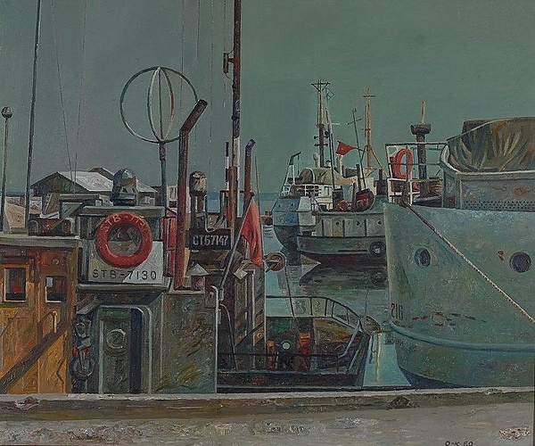На картине изображены суда у причала, что характерно для жанра марины. На переднем плане проходит узкая полоса пристани, слева видна корма катера, справа — ещё один катер, за которым в глубине располагается третий. Пространство выстроено в многоплановой композиции, создающей ощущение глубины. Небо выполнено в чистых зеленовато-голубых тонах, что определяет основную цветовую гамму работы.
