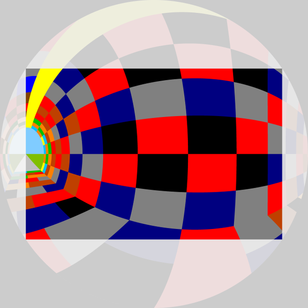 При создании обычных широкоугольных объективов стремятся свести к нулю дисторсию — искривление прямых линий, не проходящих через центр кадра. Поэтому изображение, даваемое ортоскопическим объективом, эквивалентно гномонической проекции сферы на плоскость. В таком случае невозможно получить угловое поле 180°, так как край поля зрения окажется бесконечно удалённым[13]. Для достижения полусферического обзора в объектив при его разработке намеренно вносят отрицательную дисторсию, которая обеспечивает специфическое отображение пространства, в зависимости от интенсивности искажения соответствующее той или иной геометрической проекции[41][42]. В большинстве объективов, доступных фотографам, реализована равновеликая азимутальная проекция Ламберта, достижимая минимальной оптической сложностью. При этом зависимость между фокусным расстоянием объектива и его полем зрения сложнее, чем в ортоскопических объективах, и зависит от величины дисторсии, определяющей тип проекции сферы на плоскость[43].