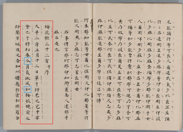 梅花歌卅二首并序 / 天平二年正月十三日,萃于帥老大伴旅人之宅,申宴會也。于時,初春令月,氣淑風和。梅披鏡前之粉,蘭薰珮後之香。加以,曙嶺移雲,松掛羅而傾蓋,夕岫結霧,鳥封穀而迷林。庭舞新蝶,空歸故鴈。於是,蓋天坐地,促膝飛觴。忘言一室之裏,開衿煙霞之外。淡然自放,快然自足。若非翰苑,何以攄情。請紀落梅之篇,古今夫何異矣。宜賦園梅,聊成短詠。[36][37]