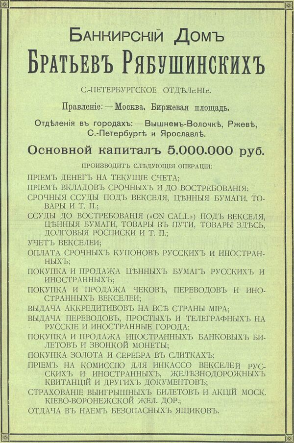 25 апреля 1902 года правление Товарищества обратилось в Министерство финансов с прошением разрешить увеличить основной капитал за счёт нового выпуска 2750 паев, которые должны были пойти не только на расширение производства, но и на банковскую деятельность. Однако прошение было отклонено и для ведения банковских операций Рябушинским было предложено открыть отдельный банкирский дом и 30 мая 1902 года был заключён договор об образовании «Банкирского дома братьев Рябушинских»; полными его товарищами-совладельцами были заявлены шесть братьев: Павел, Владимир, Михаил, Сергей и Дмитрий вносили по 200 тысяч рублей; Степан — 50 тысяч рублей. В 1903 году совладельцем стал младший брат — Фёдор, а доля участия каждого была увеличена до 714 285 рублей. В последующем основной капитал банкирского дома был увеличен до 5 млн рублей. В 1912 году он был преобразован в Московский банк с капиталом 10 млн рублей и к 1914 году вырос до 25 млн. Как и в банкирском доме, правление банка возглавляли Михаил и Владимир Павловичи Рябушинские, а также А. Ф. Дзержинский[3].