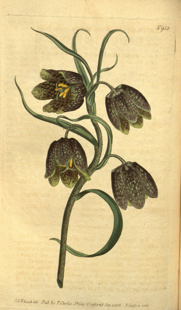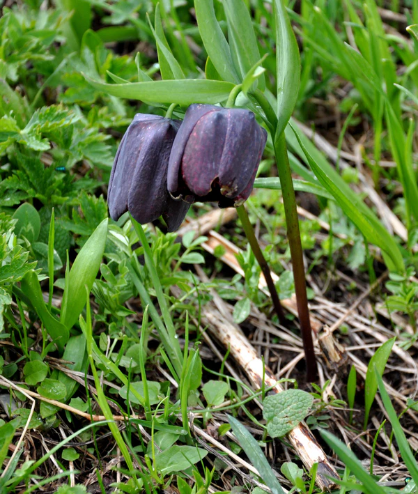 Цветок одиночный (редко их 2), поникший, 2—2,5 см длиной. Околоцветник колокольчато-конический, тёмно-фиолетовый, без шахматного рисунка. Столбик цельный, со слабо 3-лопастным рыльцем. Плод — продолговато-овальная, гладкая коробочка