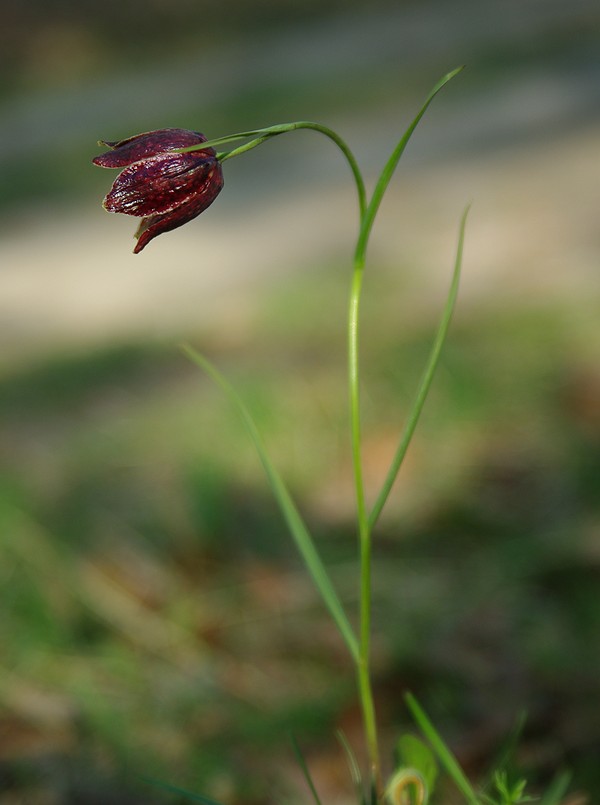 Цветок одиночный или нередко по два-три на верхушке стебля, поникший, 2—3,5 см длиной, на цветоножках длиннее верхнего листа. Цветонос длиннее верхнего листа. Доли околоцветника тёмно-буро-фиолетовые с неясным шахматным рисунком или крапчатые, 2—3 см длиной и 7—12 мм шириной. Столбик до 1⁄3 или 1⁄2 трёхраздельный. Цветёт в мае.
