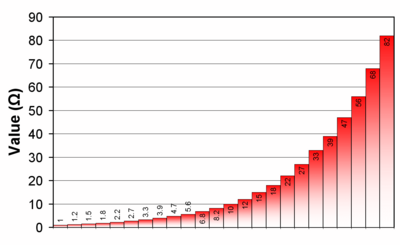 Каждый ряд соответствует определённому допуску в номиналах деталей. Так, детали из ряда E6 имеют допустимое отклонение от номинала ±20 %, из ряда E12 — ±10 %, из ряда E24 — ±5 %. Собственно, ряды устроены таким образом, что следующее значение отличается от предыдущего чуть меньше, чем на двойной допуск.