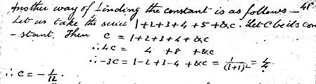 Суммирование ряда 1 + 2 + 3 + 4 + ... методом Рамануджана также позволяет получить значение −1/12. В своём втором письме к Х. Г. Харди, датированном 27 Февраля 1913, Рамануджан пишет[12]: