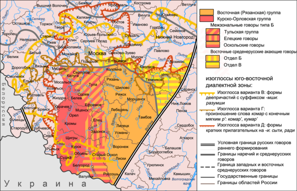 Помимо аканья из ареала говоров Рязанской земли распространялись и другие диалектные явления, повлиявшие на формирование восточных среднерусских говоров (прежде всего, акающих говоров), которые сложились при взаимодействии местных говоров ростово-суздальского диалекта с рязанскими говорами[56]. Свидетельством этого является наличие в восточных среднерусских акающих говорах (прежде всего, в говорах отделов Б и В, а также в южных говорах отдела А) новообразований рязанского происхождения разной поры[57]. Возможно, восточные среднерусские говоры отделов Б и В могли быть генетически рязанскими, испытавшими с конца XV века в период создания Русского централизованного государства и возвышения Москвы как центра влияние московских и владимирских говоров, с территорий которых на юг распространились черты северной локализации, прежде всего произношение /г/ смычно-взрывного образования[34].