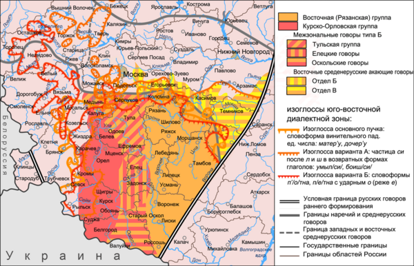 Ареал юго-восточной диалектной зоны полностью охватывает территории говоров Рязанской, Курско-Орловской и Тульской групп, а также елецких и оскольских говоров, объединяя их тем самым общими языковыми чертами. Кроме того, некоторая часть черт юго-восточной диалектной зоны отмечается (с разной степенью регулярности) в восточных среднерусских акающих говорах и в межзональных говорах А южного наречия. Языковые черты диалектной зоны группируются в несколько близких по очертаниям пучков изоглосс, один из которых выбран как основной (по большему числу диалектных явлений), а остальные считаются его вариантами[13][134].