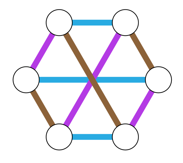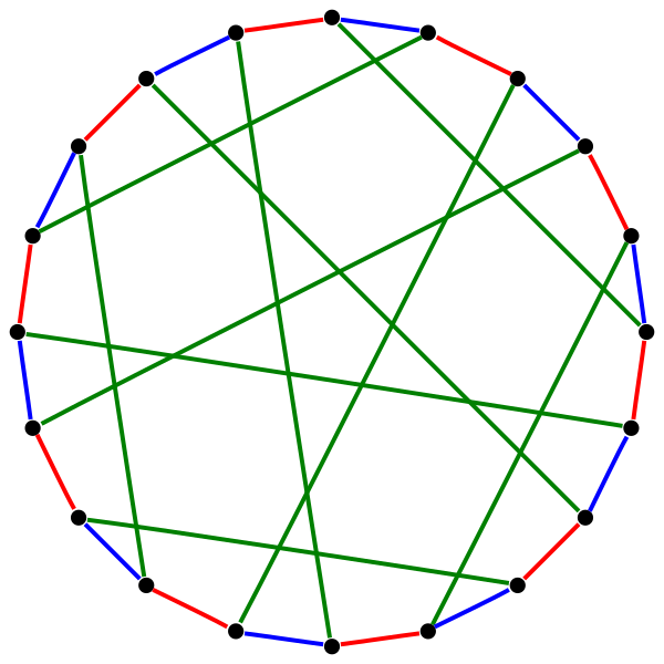 Просто проверить, можно ли рёберно раскрасить граф одним или двумя цветами так, что первый нетривиальный случай раскраски — проверка, можно ли раскрасить граф рёберно тремя цветами. В 2009 году[27] показано, что проверить, существует ли рёберная раскраска графа тремя цветами, можно за время при использовании лишь полиномиального пространства. Хотя эти временные границы экспоненциальны, это существенно быстрее, чем алгоритм поиска грубой силой путём просмотра всех возможных раскрасок рёбер. Любой двусвязный 3-регулярный граф с вершинами имеет рёберных 3-раскрасок. И всех их можно перечислить за время (чуть медленнее времени поиска одной раскраски). Как заметил Куперберг, граф призмы над -угольником, имеет много раскрасок, что показывает, что эта граница точна[28].
