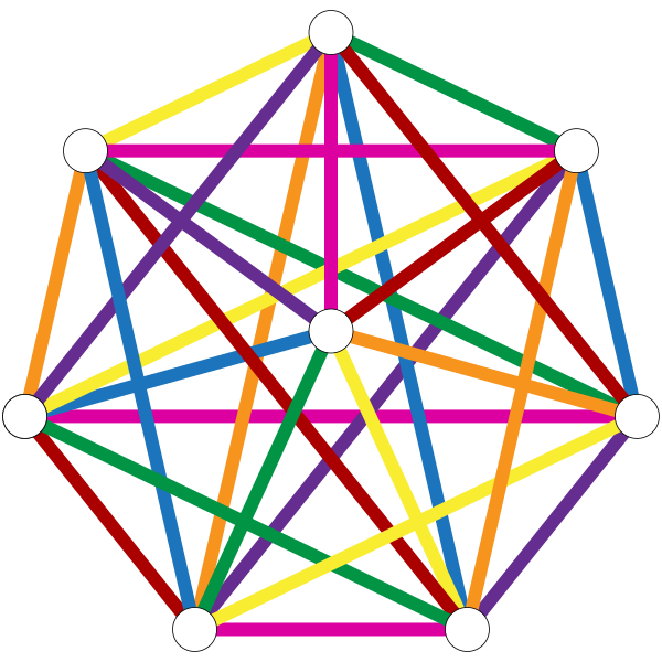 Рёбра полного графа с вершинами могут быть раскрашены цветами, если чётно. Это специальный случай теоремы Бараньяи. Сойфер[2] даёт следующее геометрическое построение раскраски в этом случае: разместим точек в углах и в центре правильного -угольника. Для каждого класса цвета выберем одно ребро, соединяющее центр и одну из вершин многоугольника, и все перпендикулярные ему рёбра, соединяющие пары вершин многоугольника. Однако если нечётно, требуется цветов — каждый цвет можно использовать только для раскраски рёбер, -ю часть всех рёбер[3].