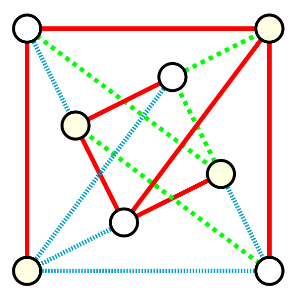 В 2008 году[28] изучена рёберная 3-раскраска кубических графов с дополнительным свойством, что никакие два двуцветных цикла не имеют более чем одно общее ребро, в частности показано, что существование такой раскраски эквивалентно существованию рисунка графа на трёхмерной целой решётке с рёбрами на прямых, параллельных осям координат, и каждая такая прямая содержит максимум две вершины. Однако, как и в случае стандартной задачи рёберной 3-раскраски, поиск раскраски этого типа является NP-полной задачей.