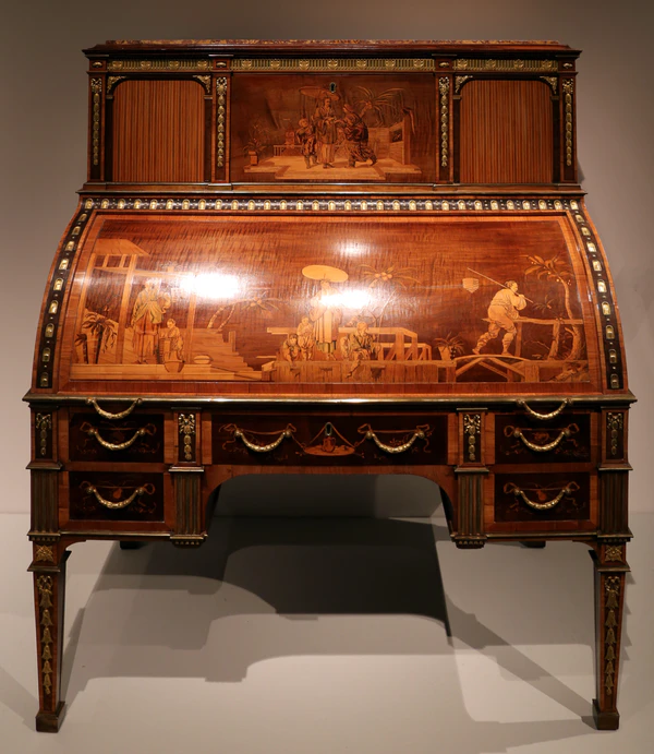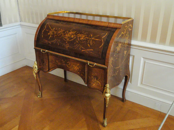 Особенную популярность снискали женские туалетные столики. Они были спроектированы так, чтобы выглядеть как письменный или чертёжный стол, но скрывали туалетные принадлежности. Пружинный спусковой крючок, скрытая защёлка или кнопка выявляли двойное назначение. Давид Рёнтген за свою изобретательность даже получил прозвание «Арлекин» в честь персонажа театра Комедия дель арте. О степени славы мастера свидетельствует упоминание о нём Гёте в «Вильгельме Мейстере». Ящик, в котором жила фея во время её путешествий со своим смертным возлюбленным, сравнивается с письменным столом Рёнтгена, в котором одним нажатием кнопки открывалось множество потайных ящиков, отсеков и механических устройств. Людовик XVI заплатил Рёнтгену за похожий стол 80 000 ливров. Внешне он был похож на комод. Панели маркетри изображали Минерву, римскую богиню мудрости и покровительницу искусств, прикрепляющую портрет Марии-Антуанетты на колонну, на которой выгравировано её имя. Сооружение венчали музыкальные часы (работа Петера Кинцинга), увенчанные куполом, изображающим гору муз Парнас. Это произведение высотой 3,4 м было чудом механической точности. Исчезло во времена Первой империи при Наполеоне Бонапарте[4].