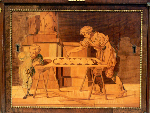 В 1780-х годах Давид Рёнтген стал использовать новые технические приёмы маркетри — декора наборного дерева, выполненного с особой тонкостью. Вместо травления и копчения дерева для передачи мелких деталей и разнообразных градаций тонов он стал использовать мелкие кусочки шпона, напоминающие «флорентийскую мозаику» (итал. pietra dura — твёрдый камень). В этой технике, изначально заимствованной у фламандских мастеров, работал сотрудничавший с Рёнтгеном с 1774 года рисовальщик, живописец и гравёр Януариус Цик[2]. Считается также, что именно Цик был изобретателем так называемых «перистых рокайлей» (нем. fedrigen Rokaillen), завитков рокайля с длинными, «колючими» отростками, или «перьями»[3].