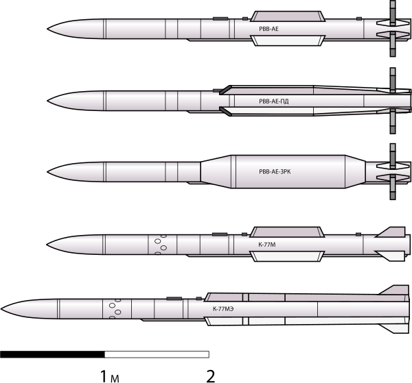 - РВВ-АЕ (изделие 190) — экспортный вариант Р-77. Активно поставлялась третьим странам. Дальность 80 км.