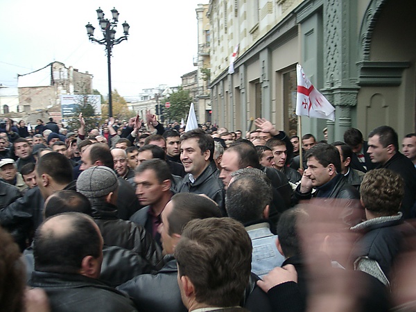 Между тем когда я в какой-то момент обходил митинг, то вдруг увидел, как со спины Иосифа Сталина подъехал тёмно-синий новенький внедорожник УАЗ и из него вышел Михаил Саакашвили в сопровождении нескольких телохранителей с микрофонами в ушах. Они действовали очень профессионально, в одно мгновение сделав проход в толпе. Михаил Саакашвили поднялся на трибуну. Я увидел харизматичного лидера. Каждое его слово вызывает стон восторга. Люди даже не понимают, что он говорит. Их это совершенно не интересует. Им достаточно ощущать, что он с ними, а тем более видеть его своими глазами. На самом деле, Михаил Саакашвили говорил интересные вещи. Так, он заявил, что Шеварднадзе только что назначил повторные выборы, но никого это уже не интересует. Он сказал, что на площади перед парламентом дежурит кучка предателей из Аджарии в три сотни человек и что эту кучку в мгновение ока сметёт волна народного гнева. Между тем, я-то видел, что на площади дежурят, по крайней мере, несколько тысяч человек. Но господин Саакашвили хотел укрепить и без того сильнейший боевой дух своих людей. У него всё получалось.