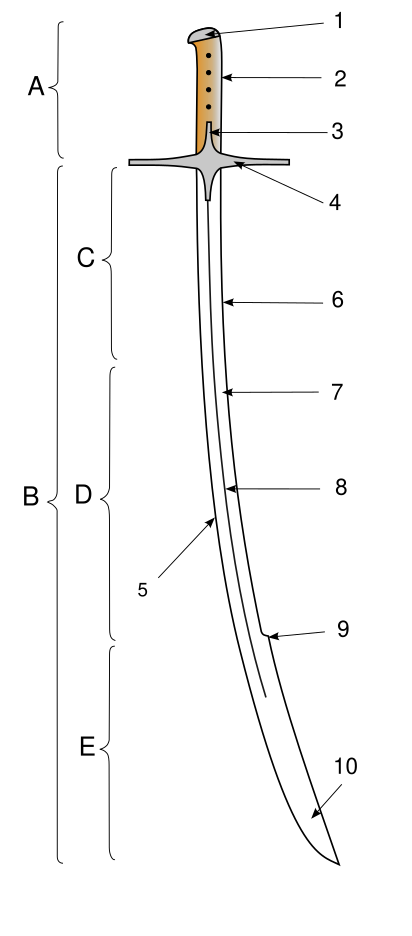 Конструкция сабельной рукояти была более лёгкой, чем у меча. Черен, как правило, был деревянным, с металлическим навершием (набалдашником), как правило, уплощённо-цилиндрической формы в виде колпачка, надеваемого на черен. Это навершие обычно снабжалось кольцом для крепления темляка. В IX—XI веках были распространены прямые крестовины с шарообразными увенчаниями на концах, которые потом получают изгиб в сторону острия. В XI веке получают распространение крестовины ромбовидной формы, известные ещё у первых сабель — перекрестья увеличивали прочность конструкции.[8]