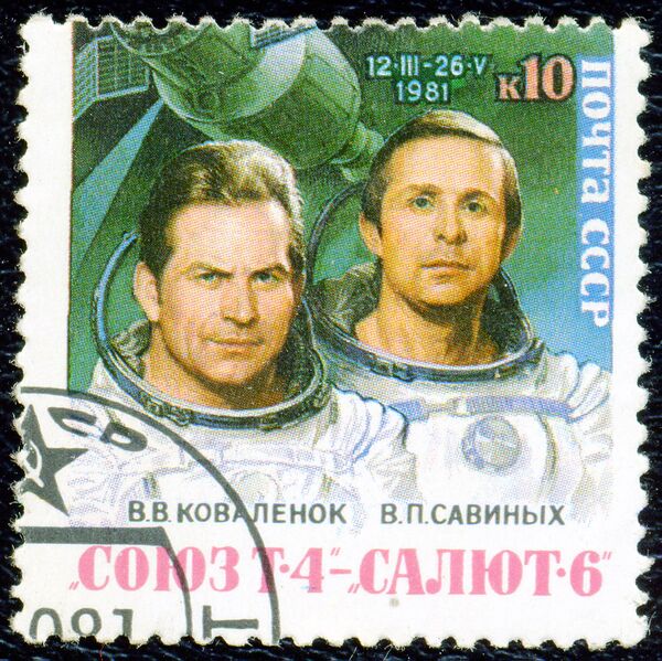 Электронная репродукция сцепки из двух почтовых марок: Исследования на орбитальном комплексе «Союз-Т-4» — «Салют-6». Космонавты В. В. Коваленок и В. П. Савиных / художники: В. Джанибеков, Г. Комлев. 1981