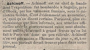 Экспедиция Ашинова наделала много шума в печати вследствие ложных слухов о значительном числе её участников. Несколько человек, причастных к экспедиции, бежали в Обок — французскую территорию неподалёку. Французам стало известно, чем занимаются ашиновцы и где располагается русская колония, это и сыграло судьбоносную роль.