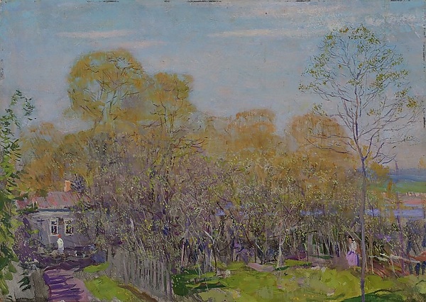 На картине изображён весенний сад, в котором только начинает появляться первая зелень. В левой части полотна видны сиреневые блики, играющие на дорожке и среди листвы. На заднем плане находится одноэтажный дом с двумя окнами, от которого влево отходит дорожка. Перед домом размещена обобщённая фигура женщины в белой кофте и красной косынке. Справа, у ствола дерева, изображена стоящая в полный рост девушка в сиреневой юбке и светлой кофте. Картина отличается мягкой цветовой гаммой с преобладанием сиреневых и зелёных оттенков.