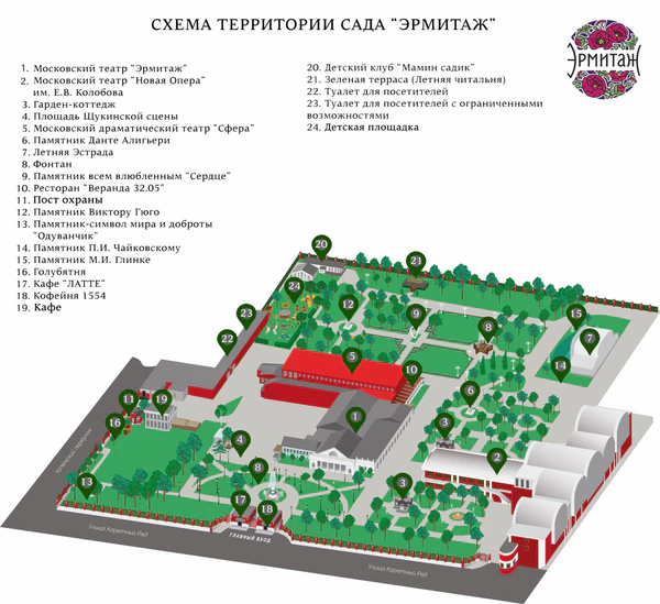 Сад «Эрмитаж» расположен в центре Москвы по адресу: г. Москва, ул. Каретный ряд, вл. 3. Находится в пешеходной доступности от нескольких станций метро.