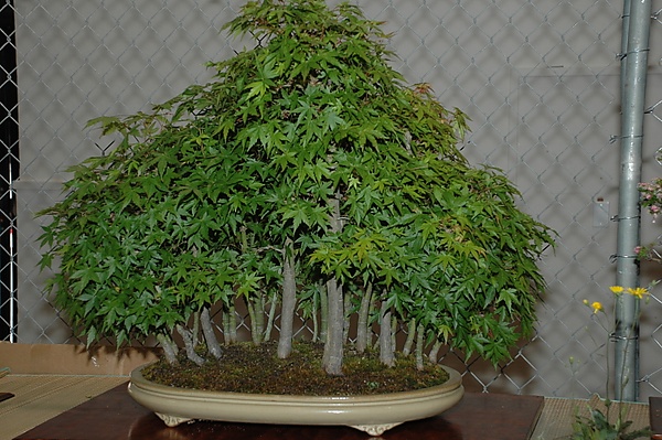 С другой стороны, стили бонсая, в которых используется несколько деревьев, отличаются более простым ландшафтом[2]. Деревья в бонсай обычно высаживаются так, чтобы создать единый силуэт, где они образуют сплошную лиственную массу позади и по бокам от стволов[8]. В бонсае деревья полностью доминируют в групповой посадке, в то время как в сайкее деревья служат лишь украшением ландшафта.