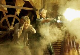 На Сибил во время схватки с культистами не было никакой защиты, в то время как под робами горняков находились защитные металлические пластины. Поэтому каждый раз, нанося удар по ним, Холден получала ссадину или синяк. Сцену, в которой Рада и Лори оказываются запертыми в маленькой вентиляционной комнате, оператор снимали спереди, чтобы зрители видели лица актрис. Холден считала, что ей придётся применить воображение в этом эпизоде, однако нож, прорезающий дверь, был настоящим. Актрисе требовалось убирать голову в определенный момент, иначе существовала угроза быть задетой лезвием. Сцена в бойлерной показалась сложной и Митчелл, поскольку ей приходилось быстро прогибаться назад каждый раз при появлении ножа. При тренировках сцена происходила с небольшой скоростью, но с каждым последующим повторением она повышалась, пока не достигла требуемой.
