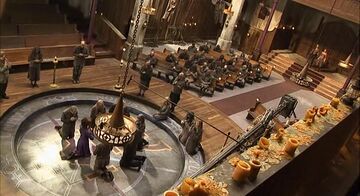 Чтобы создать помещение, где происходили встречи всего сообщества города, декораторы использовали старую фабрику. Его внешний вид был выдержан в стиле старинных фотографий: простой дизайн с прямыми линиями. После окончания съёмок сцен собрания пол был фрагментарно разобран. Команда разводила костры на площадке, имитируя последствия большого пожара. Кэрол отмечала: «…это была самая грязная сцена во всем фильме. И все, кто оказывался на площадке в одежде белого цвета к концу съёмок неизменно оказывался чёрным».