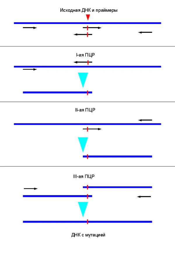Ограниченное число сайтов рестрикции в кассетном мутагенезе может быть преодолено с помощью полимеразной цепной реакции с олигонуклеотидными «праймерами», таким образом, что больший фрагмент может быть сформирован, охватывая два удобных сайтов рестрикции. Экспоненциальная амплификация в ПЦР дает фрагмент, содержащий нужную мутацию в количестве достаточном, чтобы быть отделенным от оригинала, немутированной плазмиды, с помощью гель-электрофореза, который затем может быть вставлен в исходном контексте с использованием стандартных рекомбинантных методов молекулярной биологии. Есть много вариантов этого метода. Самый простой способ помещает сайт мутации к одному из концов фрагмента, в результате чего один из двух олигонуклеотидов, используемых для генерации фрагмента содержит мутацию. Этот способ включает в себя один шаг ПЦР, но по-прежнему имеет проблему требования подходящего сайта рестрикции вблизи сайта мутации, если не используется очень длинный праймер. Другие варианты, следовательно, используют три или четыре олигонуклеотида, два из которых может быть немутагенными олигонуклеотидами, которые охватывают два участка рестрикции и дают фрагмент, который может быть рестрицирован и лигирован в плазмиду, в то время как мутагенный олигонуклеотид может быть комплементарен к местоположению в пределах этого фрагмента от любого удобного сайта рестрикции. Эти методы требуют несколько этапов ПЦР так, чтобы конечный фрагмент, чтобы быть лигирован может содержать требуемую мутацию. Процесс проектирования для генерации фрагмента с желаемой мутацией и соответствующими сайтами рестрикции может быть громоздким. Программы, такие как SDM-Assist могут упростить данный процесс.