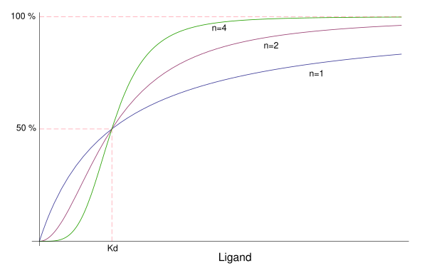 Кривые связывания описывают процесс связывания лиганда с белком. Кривые могут быть охарактеризованы их формой, сигмоидальной или гиперболической, которая отражает, проявляет ли белок кооперативное или некооперативное поведение связывания соответственно[32]. Обычно ось абсцисс описывает концентрацию лиганда, а ось ординат описывает фракционное насыщение лигандов, связанных со всеми доступными сайтами связывания[5]. Уравнение Михаэлиса Ментен обычно используется при определении формы кривой. Уравнение Михаэлиса Ментен выводится на основе стационарных условий и учитывает ферментативные реакции, протекающие в растворе. Однако, когда реакция происходит, когда фермент связан с субстратом, кинетика развивается по-другому[33].