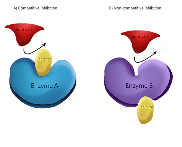Конкурентные ингибиторы конкурируют с субстратом за связывание со свободными ферментами в активных центрах и, таким образом, препятствуют образованию комплекса фермент-субстрат при связывании. Например, отравление оксидом углерода вызвано конкурентным связыванием оксида углерода, в отличие от кислорода в гемоглобине.